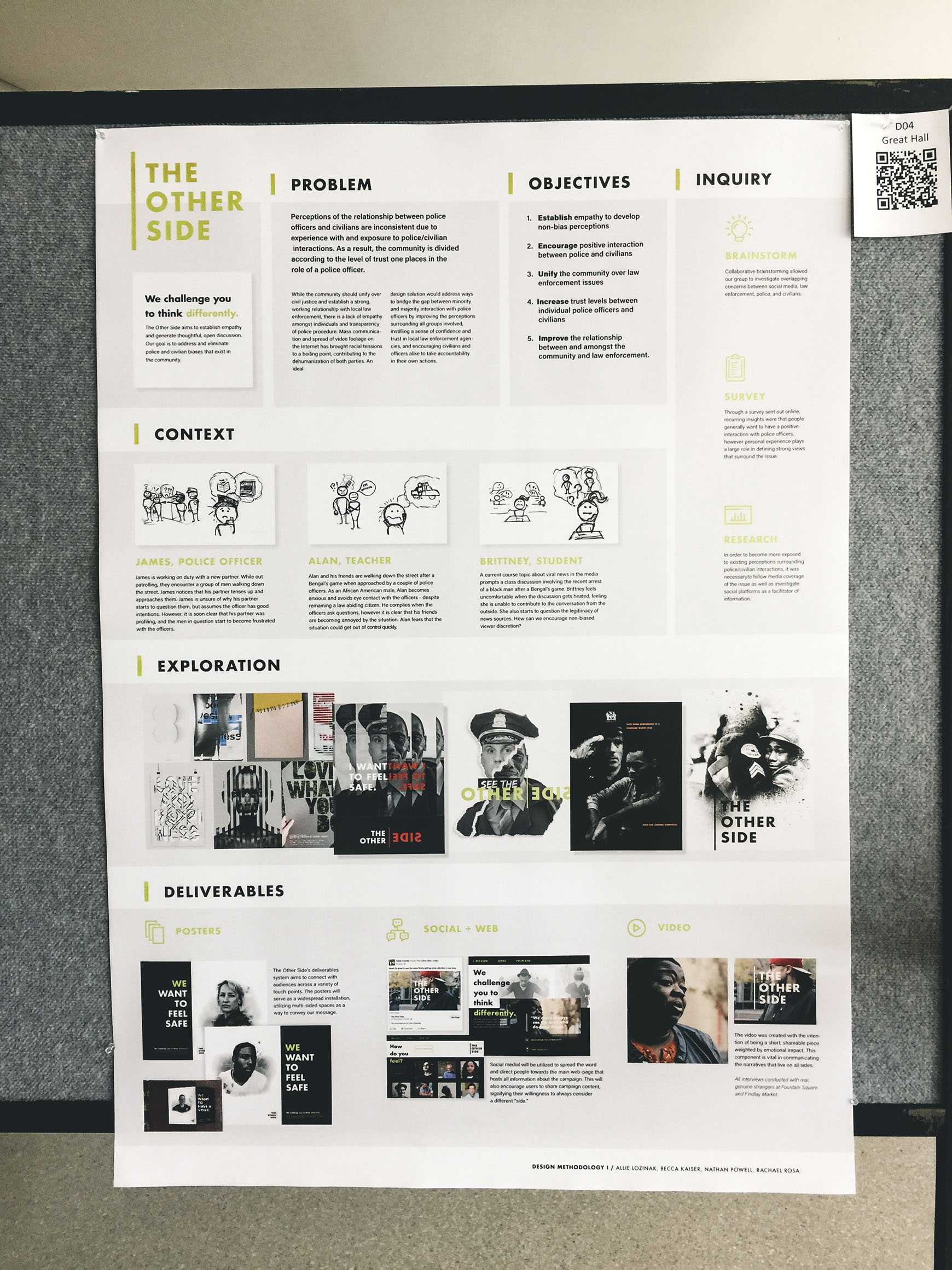 Our group's goal was to learn of and address biases that exist within the Cincinnati community from a position of empathy towards people of color. The primary deliverables aimed to connect with audiences across a variety of touch-points, including emotionally charged imagery, public installations, social media awareness, and political activism.